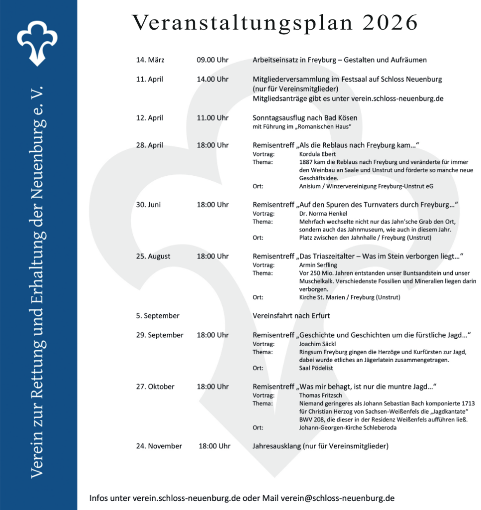 Des Weiteren sind Sie herzlich zu folgenden Veranstaltungen des Vereins zur Rettung und Erhaltung der Neuenburg e.V. eingeladen: